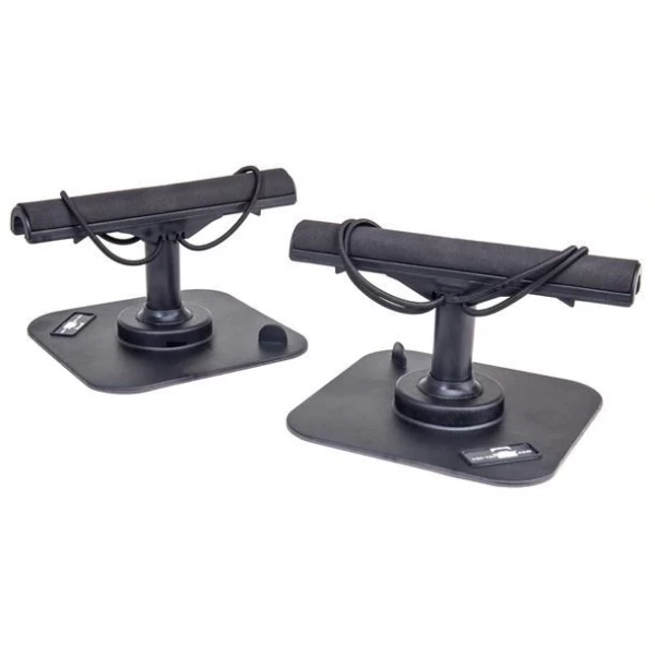 Rounded “T” bar and shock cords allow rods to be mounted at any angle, not just in line with the base. Rods are secured by fabric covered straps for extra security, it had also soft padding for the rods.